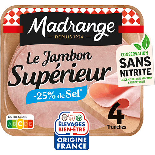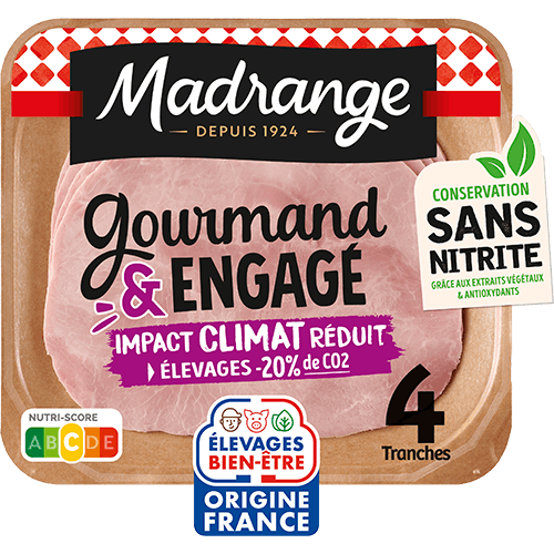 Vous l’aurez compris, le jambon blanc est au centre de nos gammes de produits Madrange. Cuit selon les différentes recettes les plus appréciées des Français, le jambon blanc se décline pour satisfaire tous les palais, même les plus exigeants ! Notre politique RSE et développement durable et nos engagements de marque nous incitent également à soigner nos modes de conditionnement et de fabrication. Ainsi, nous proposons du jambon blanc élaboré à partir de viande de porcs français issus de notre coopérative, produit dans nos ateliers du Limousin, dans des emballages recyclables majoritairement constitués de papier issu de forêts gérées de façon durable.